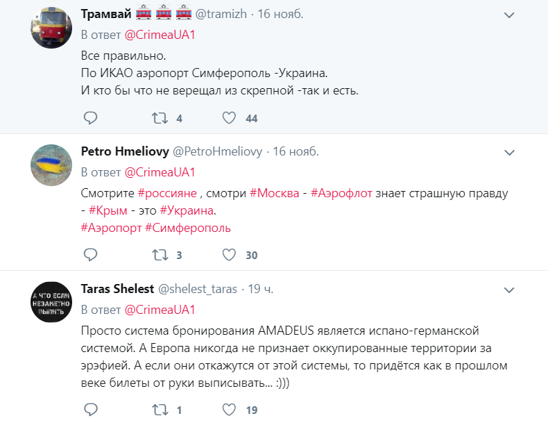 "Просто Amadeus – испано-германская система, а Европа никогда не признает оккупированные территории за РФ", "Перемога! Даже рашисты верят, что Симферополь – это Украина", "Смотрите, россияне! "Аэрофлот" знает страшную правду!", – написали они.