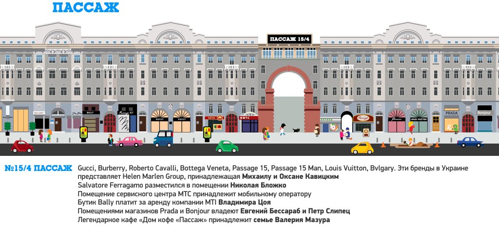 Журналистка издания Forbes.ua Нина Мищенко провела в прошлом году детальное расследование того, кому принадлежит коммерческая недвижимость на главной улице Украине - Крещатике. За это время мало что изменилось, разве лишь то, что Майдан понизил доходы «регионалов».