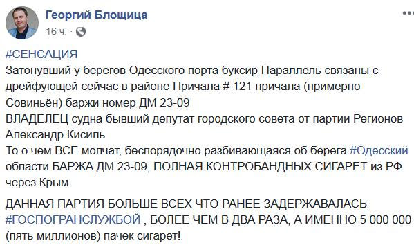 По сообщениям правозащитника Георгия Блошицы, на ее борту находится рекордная партия контрабандных сигарет, которую переправляли из Крыма в Болгарию. По неподтвержденным пока данным, в перевозке участвовал затонувший вчера буксир «Параллель», экипаж которого спас танкер «Аркадия». Во время шторма буксир получил повреждения и отцепил баржу, которую уже далее прибило волнами на пляж.