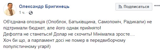 "Объединенная оппозиция (Оппоблок, Родина, Самопомочь, Радикалы) не поддержали бюджет, но его однако принято! Дефолта не случится! Доллар не вскочит! Минималка вырастет .... Хоть бы что, а парламент до сих пор не умер в предвыборном популистском угаре!)", - подчеркнул Александр Бригинец.