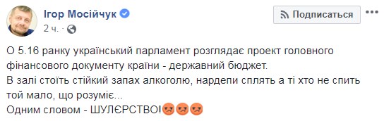 "В 5:16 утра украинский парламент рассматривает проект главного финансового документа страны - государственный бюджет. В зале стоит стойкий запах алкоголя, нардепы спят, а те кто не спит то мало, что понимает... Одним словом - ШУЛЕРСТВО!", - пишет нардеп от РПЛ Игорь Мосийчук.