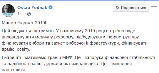 "Имеем Бюджет 2019! Этот бюджет я поддержал. В важном 2019 году нужно будет внедрять медицинскую реформу, восстанавливать инфраструктуру, финансировать выборы и защиту избирательной инфраструктуры, финансировать армию, образование. И наконец – у нас будет транш МВФ. Это - залог финансовой стабильности и надежности нашего государства как заемщика. Это - укрепление нацвалюты", - уверен Остап Еднак.