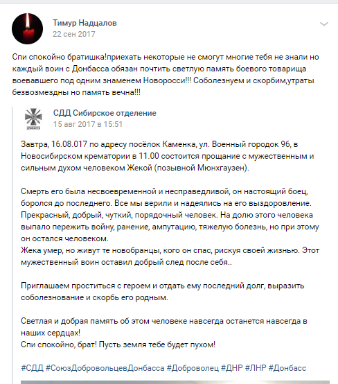 Также он скорбил по поводу смерти боевика "Мюнхгаузена". Переживал, что не сможет приехать на прощание с другом в Новосибирский крематорий. Называет его "боевым товарищем, воевавшем под одним знаменем Новороссии".
