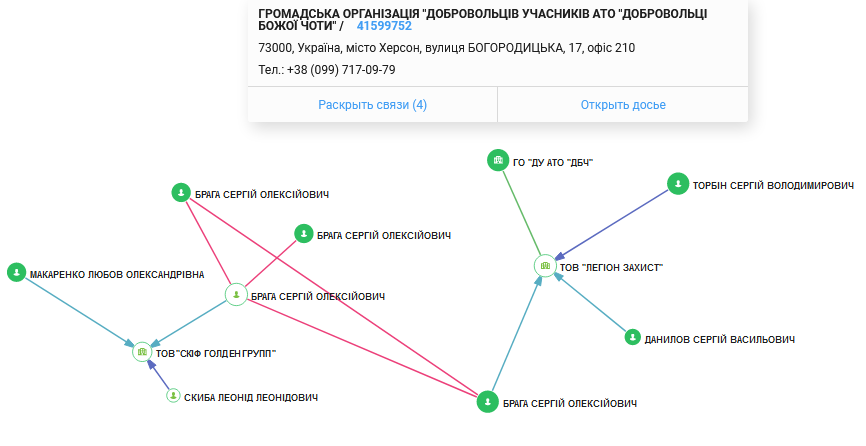 Ресурс https://youcontrol.com.ua подсказывает, что «Никто кроме нас» и «Черный туман» связаны учредителями. А цепочка связей от «Добровольцев Божьей четы» Торбина через Брагу ведет к лесопилке ООО «Скиф голден групп».