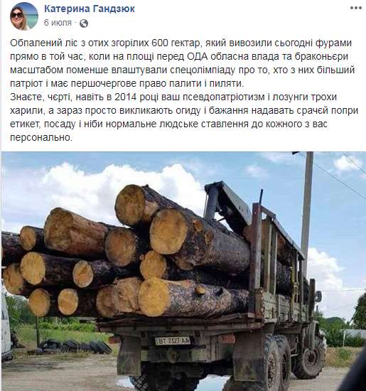 6 июля Катерина опубликовала фото подгоревшего леса, который вывозили фурами прямо во время митинга у облгосадминистрации. Назвала браконьерами обе стороны.