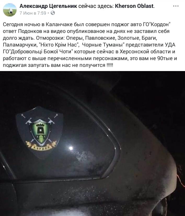 13 апреля 2018 года неизвестные сожгли два автомобиля «кордоновцев» и подбросили похоронный венок с надписью «Спи спокойно» предводителю «Кордона» Александру Цегельнику. В ухвале за 09.07.2018 говорится, что пострадавшие подозревают представителей «Черного тумана» и «Никто кроме нас». А заодно и помощника нардепа Игоря Павловского (фамилий в реестре нет, но угадать не сложно): http://reyestr.court.gov.ua/Review/75180952