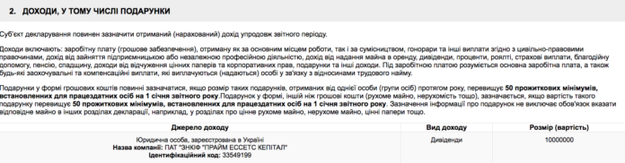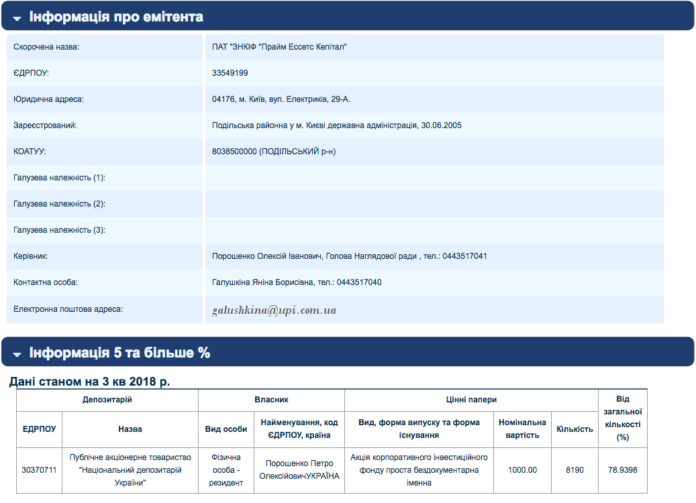 Президент України Петро Порошенко вніс у свою декларацію 15 мільйонів гривень дивідендів ПАТ “ЗНКІФ “Прайм Ессетс Кепітал”.