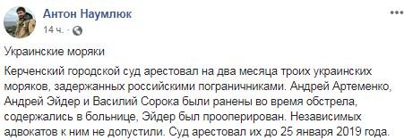 “Андрей Артеменко, Андрей Эйдер и Василий Сорока были ранены во время обстрела, содержались в больнице, Эйдер был прооперирован. Независимых адвокатов к ним не допустили. Суд арестовал их до 25 января 2019 года”, – подчеркнул журналист.