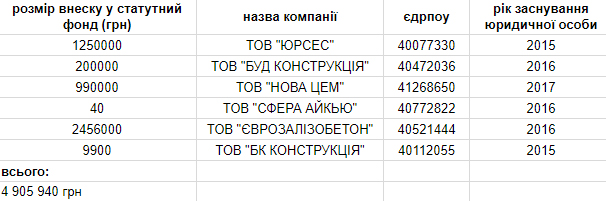 Вместе с тем, мы нашли все компании, где Андрей Ковальчук является учредителем, и сопоставили его взносы в уставные фонды. Оказалось, что в свой бизнес он вложил 4 905 940 грн. При этом, 2 456 000 грн он вложил в компанию ТОВ "ЄВРОЗАЛІЗОБЕТОН" в 2016 году. Где он взял эту сумму - загадка. Вероятно, иного решения, кроме «засекретить» доходы мужа, Альбина Ковальчук найти не могла. Ведь, очевидно, что к происхождению средств возникли бы вопросы.