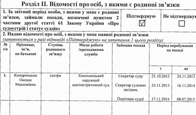 Сестра Альбины Николаевны 28-летняя Оксана Комарницкая внесена в декларацию родственных связей. Там она указана как секретарь судебных заседаний и помощник судьи.