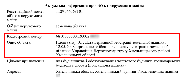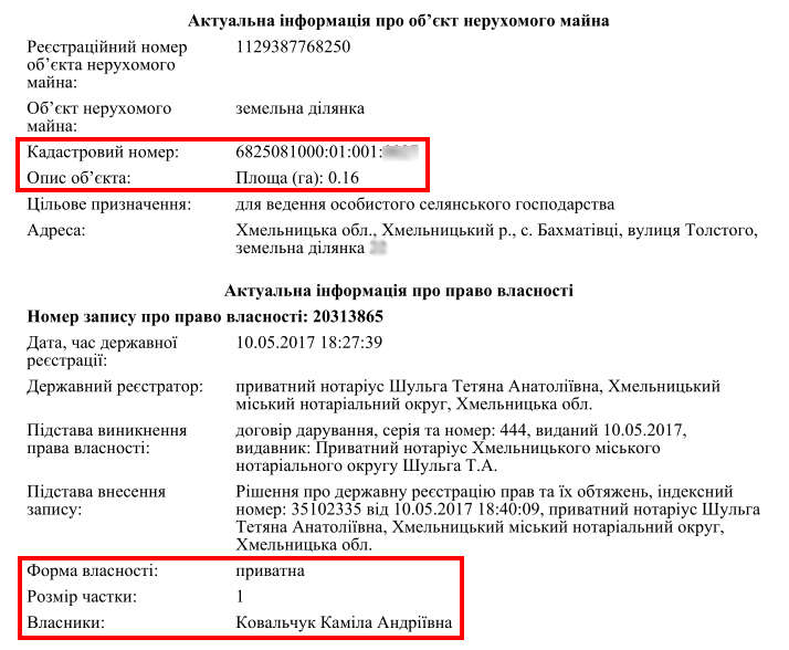 По состоянию на 2017 год судья владела двумя земельными участками в пределах Хмельницкого района 0,10 га (подарен отцом в 2007 году) и 0,16 га (приобретен бесплатно для личного крестьянского хозяйства в 2006 году). В то же время Андрей Ковальчук владел одним участком на 0,04 га.