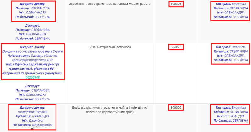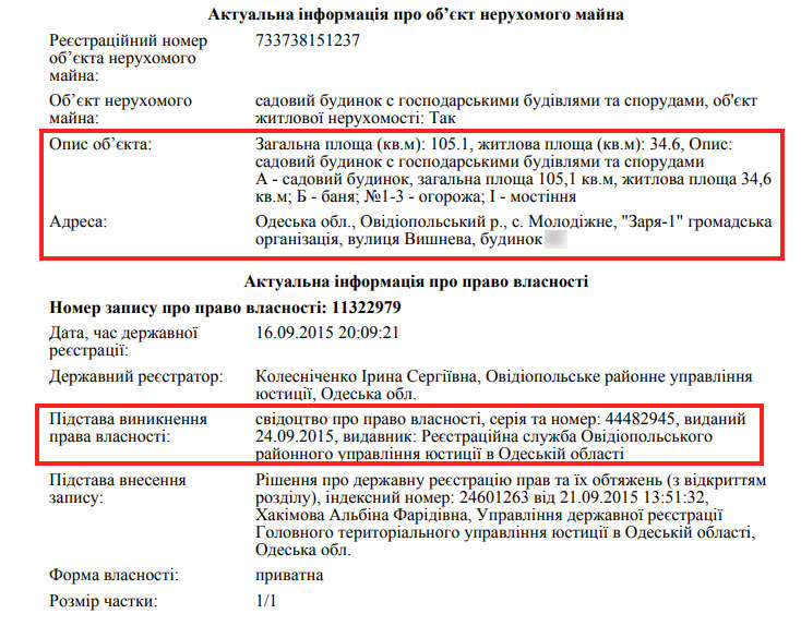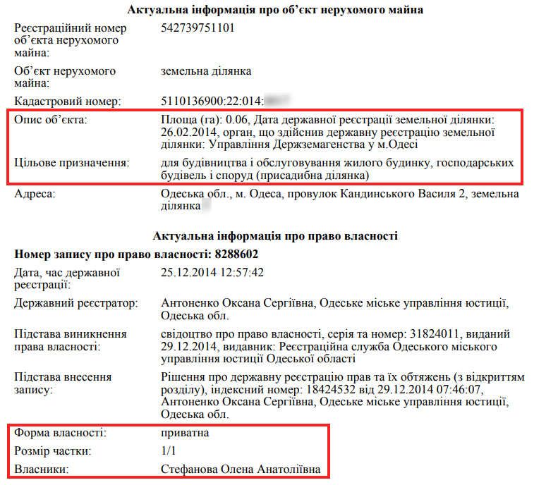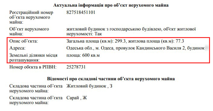Дружина у 2014 році теж набула ділянку на 600 кв. м, алев Одесі. Ймовірно, земля виділена безоплатно для будівництва.