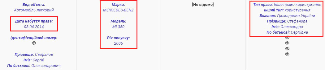 Суддя Сергій Стефанов декларує право користування автомобілем MERSEDES-BENZ ML350, який належав його дочці Олександрі. За рік до придбання транспортного засобу, вона вступила до Одеської юридичної академії, тобто була студенткою. Цілком ймовірно, що справжнім власником авто був Сергій Стефанов, і MERSEDES формально записав на Олександру. У 2016 році його було притягнуто до адміністративної відповідальності за проїзд перехрестя на червоне світло, будучи за кермом вказаного автомобіля. Однак у суді Сергія Олександрович домігся скасування постанови.