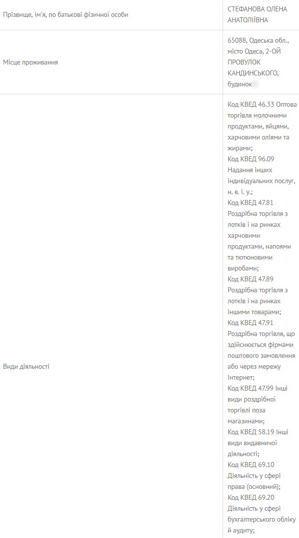 Стефанова Олена Анатоліївна зареєстрована як фізична особа-підприємець з 2009 року. Основний КВЕД – діяльність у сфері права.