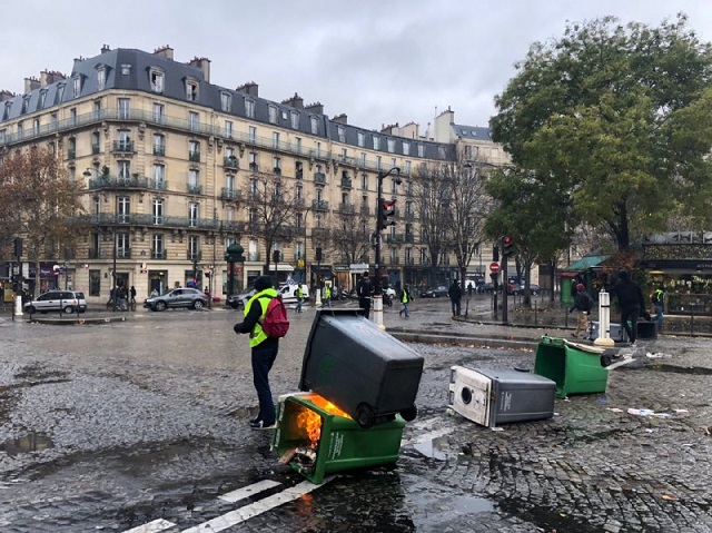 Как можно увидеть на фотографиях, протестующие возводят на улицах Парижа баррикады и жгут костры.