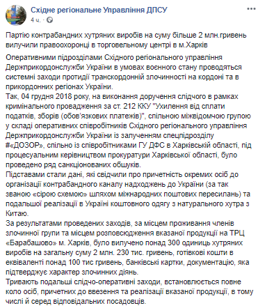 Уточняется, что ряд обысков был проведен во вторник, 5 декабря, в Харькове в рамках борьбы с уклонением от уплаты налогов. У следствия была информация о контрабанде меховых изделий по так называемой "серой схеме" - почтовыми посылками из Китая.
