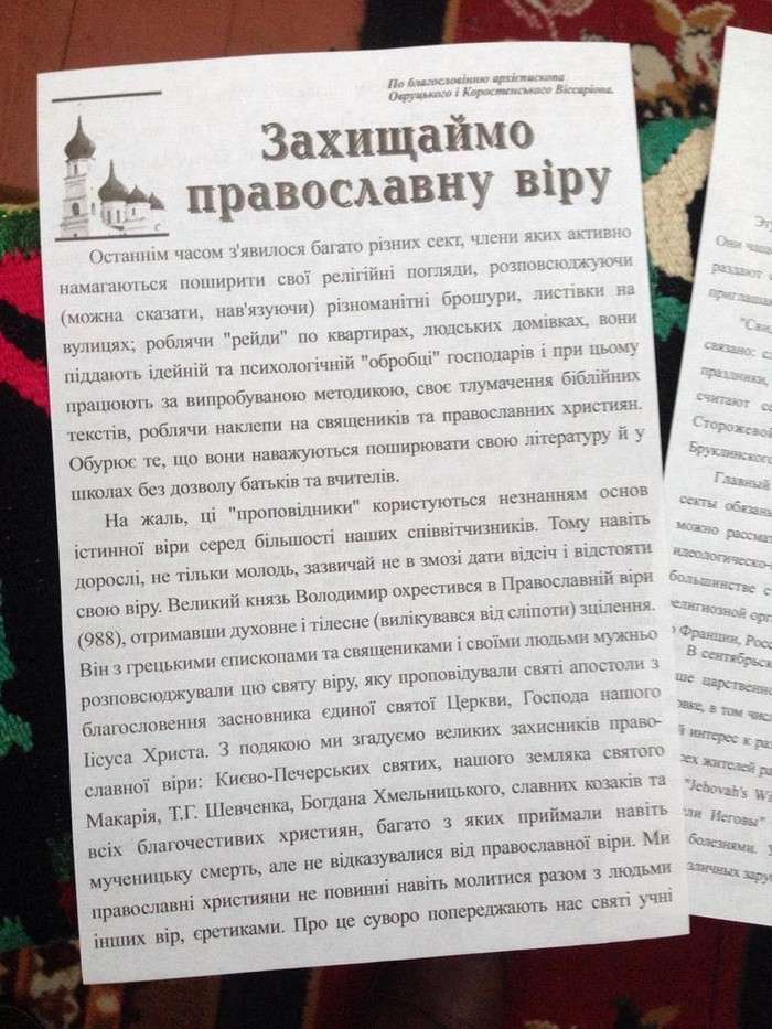 За результатами обшуків вилучено чимало друкованої продукції, зміст якої має ознаки розпалювання релігійної та міжконфесійної ворожнечі. Серед іншого протягом двох діб вилучено 75 примірників брошури «УКРАЇНСЬКА ПРАВОСЛАВНА ЦЕРКВА: Відносини із державою. Ставлення до АТО та церковного розколу. ПИТАННЯ І ВІДПОВІДІ», що вже потрапляла в поле зору СБ України, і на яку вже є відповідний висновок експерта.