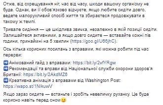"Длительное сидение - это вредная привычка, независимо в какой позиции сидеть. Оставайтесь активными, а если долго сидите - вставайте каждые полчаса, по крайней мере на 5 минут",- подытоживает Супрун и дает в своем посте несколько ссылок на полезные упражнения.
