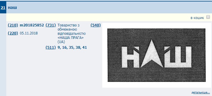 Є заявка ТОВ «Наша Прага» від 5 листопада 2018 року на реєстрацію логотипа «Наш»: