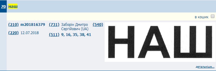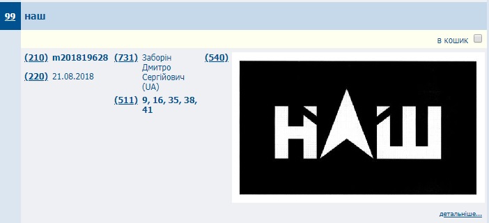 «Детектору медіа» також не вдалося знайти в базі даних заявок на знаки для товарів і послуг, прийнятих до розгляду, заявок на реєстрацію логотипа «#Наш» від ТОВ «Наше медіа» або ж датованих 25 червня 2018 року.