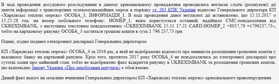 «Однако в поданной электронной декларации Генеральным директором КП «Харьковские тепловые сети» за 2016 год не отражены ведомости о наличии денежных средств в указанном банке на карточном счету», – сказано в постановлении суда. То есть у директора «ХТС» есть некий тайный счет, на котором лежит больше полутора миллиона гривен, которые были получены неизвестно от кого и за что.