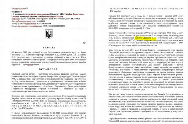 Виктор Татьков, экс-председатель Высшего хозяйственного суда Украины, против которого дал показания Владислав Дрегер 4 октября 2018 года решением Подольского районного суда в закрытом судебном заседании было удовлетворено ходатайство на обыск у Татькова и близких к нему лиц. Обыск проводился в уголовном производстве № 12013110060002990 от 02.04.2013 года, досудебное расследование по которому осуществляется Управлением специальных расследований Генеральной прокуратуры Украины. В рамках данного уголовного дела Татькова и Емельянова обвиняют в «создании устойчивого иерархического объединения» для получения неправомерной выгоды. Кроме того в постановлении на обыск, которое есть в распоряжении редакции, указывается, что в период с сентября 2009 года по 3 декабря 2010 Виктор Татьков, якобы путем злоупотребления доверием Владислава Дрегера и Дмитрия Сазонова (давний знакомый Дрегера,они вместе учились в институте), завладел имущественными активами ЗАО «Зуевский энергомеханический завод»». Напомним, это тот самый завод, из-за которого Дрегер сел во время Януковича и за который мстил Белгородскому.