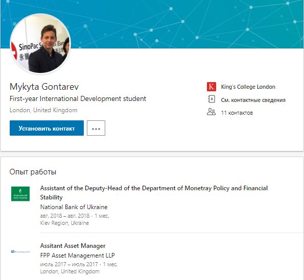 Указано, что парень в августе этого года работал ассистентом главы Департамента финансовой стабильности НБУ, а до этого в июле 2017 года - в Лондоне был помощником управляющего активами компании FPP Asset Managment LLP.