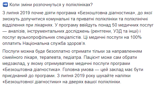 "Со второй половины 2019 за медицинские услуги в поликлиниках начнет платить Национальная служба здоровья. Тогда без направления семейного врача медицинские услуги в учреждениях, которые получают оплаты от Нацслужбы здоровья, будут для пациентов платными. Обращение без направлений будут оплачиваться НСЗУ только в строго определенном перечне случаев", - написала она.