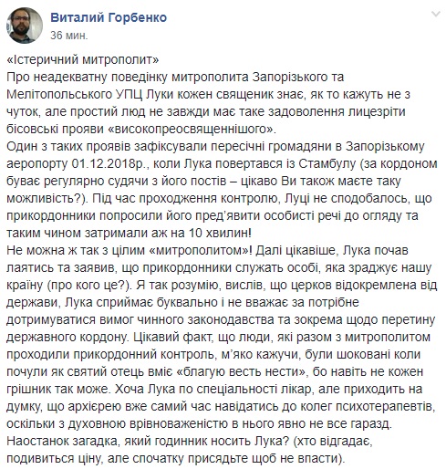 Так, митрополит Запорожский и Мелитопольский Лука (в миру Коваленко Андрей Вячеславович) 1 декабря возвращался в Запорожье из Стамбула и вместе с другими пассажирами проходил паспортный контроль.