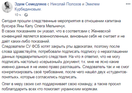 “Олег в меру своих сил поддерживает свою команду, а также просил поблагодарить всех кто помогает украинским морякам”, – отметил адвокат Эдем Семедляев.