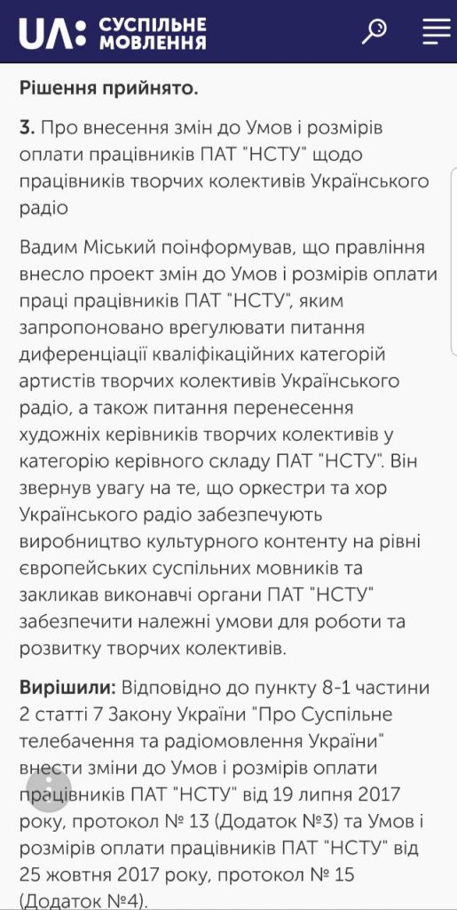 Для сравнения, средняя зарплата журналиста НОТУ составляет 5-7 тысяч в месяц. При этом платят ключевым специалистам меньше, чем музыкантам симфонического оркестра, который числится в НОТУ. По данным «Страны», музыкантам с недавних пор платят по 15 тысяч гривень. Каким образом рост заработных плат оркестра влияет на рейтинги НОТУ — не очень понятно.