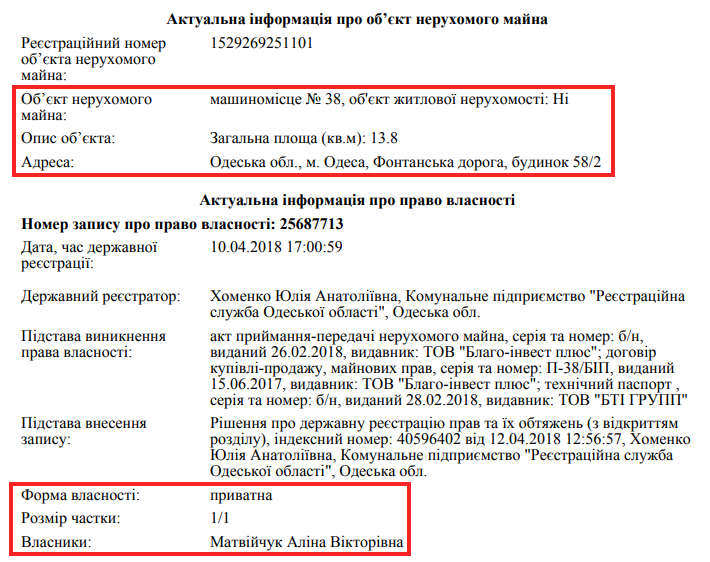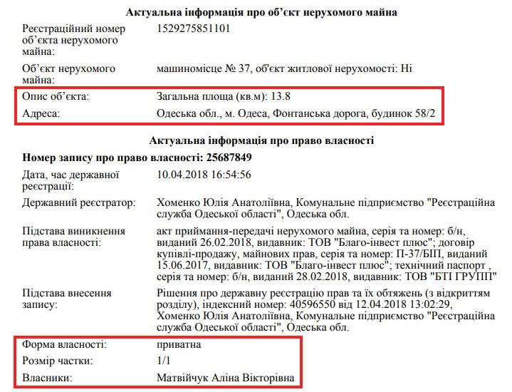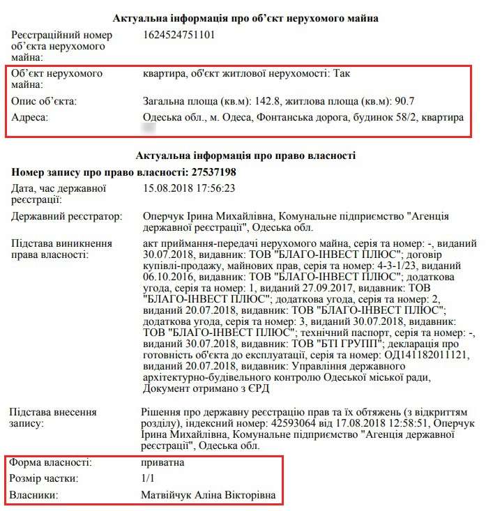 В автобіграфії кандидата на посаду члена ВРП Віктор Матвійчук написав, що має доньку Аліну Матвійчук, котра нині вчиться на 6 курсі юридичної академії в Одесі. Звісно, прокурор не вніс її ім’я у майнову декларацію. Ми ж вирішили подивитися, яким майном володіє Аліна Вікторівна. Виявилось, що студентка літом зареєструвала простору квартиру на 142 кв. м в Одесі за 15 хв пішки до моря.