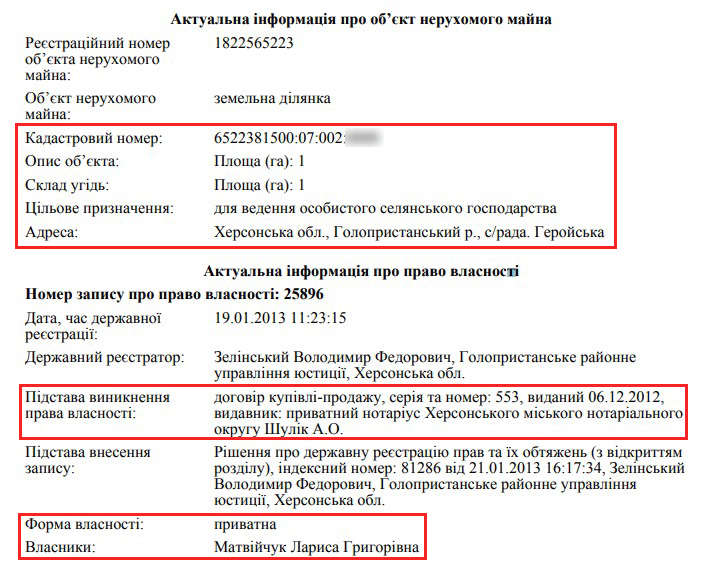 У власності подружжя три земельні ділянки в межах Херсонської області (0,12, 0,10 та 1 га)Найбільший наділ був куплений дружиною прокурора у 2013 році для ведення господарства. Вартість на дату набуття становить 10 359 грн.