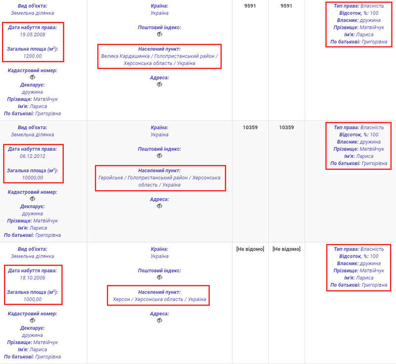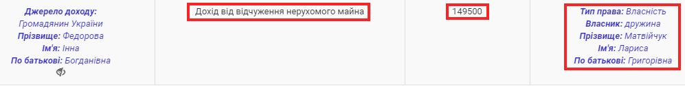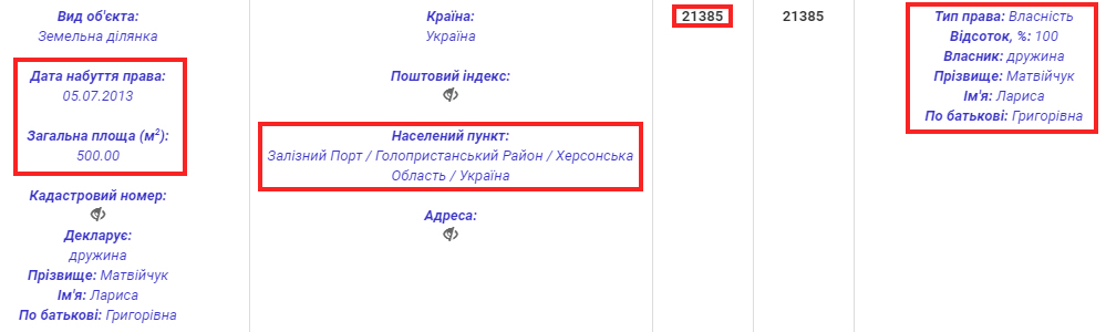 У 2016 році Лариса Матвійчук відчужила нерухоме майно – земельну ділянку на 500 кв. м у Херсонській області за 149 500 грн. Нагадаємо, що це порогова сума готівкового розрахунку.