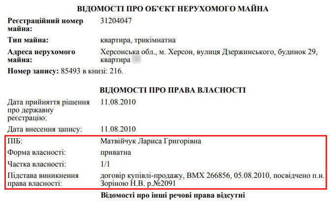 Але житло з найбільшою площею в 298 кв. м отримав Віктор Матвійчук у 2008 році. Згідно з реєстром свідоцтво про право власності видане Херсонським виконкомом. Отже, йдеться про приватизоване службове житло. Незрозуміло, на яких підставах та з якою метою Віктору Володимировичу вдалося привласнити таку велику квартиру, адже в родині всього двоє дітей, якщо вірити автобіографії кандидата.