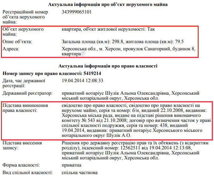 Крім того, дружина Лариса Григорівна з 2010 року володіє квартирою у Херсоні на 155 кв. м. У декларації зазначено, що її вартість становила 127 176 грн.