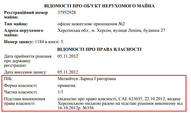 У подружжя також є два гаражі, паркінг та офісне приміщення у Херсоні на 157 кв. м. Останнє теж було надане Ларисі Матвійчук Херсонською міською радою на підставі рішення виконкому. У 2012 році воно коштувало аж 420 000 грн, або приблизно 52 000 доларів.