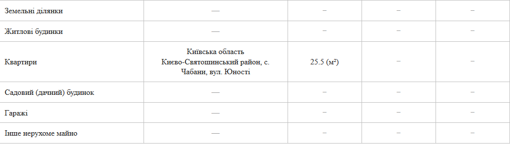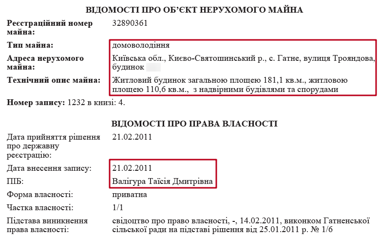 Також суддя має 50% на квартиру в Чабанах, що під Києвом. Інша частина квартири знаходиться у власності його матері Таїси Дмитрівни Валігури.