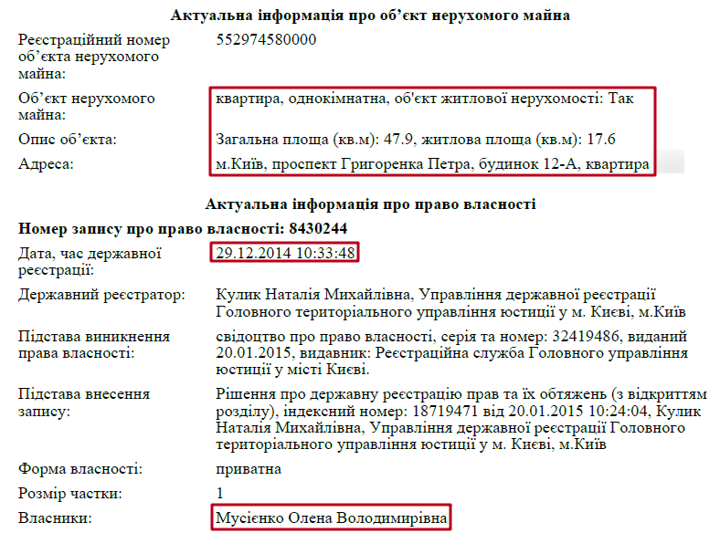 Матір єдиної дитини судді – Олена Володимирівна Мусієнко у 2014 році стала власницею квартири в Києві за адресою: проспект Григоренка Петра, будинок 12-А. Площа цього житла – 47 кв. м.