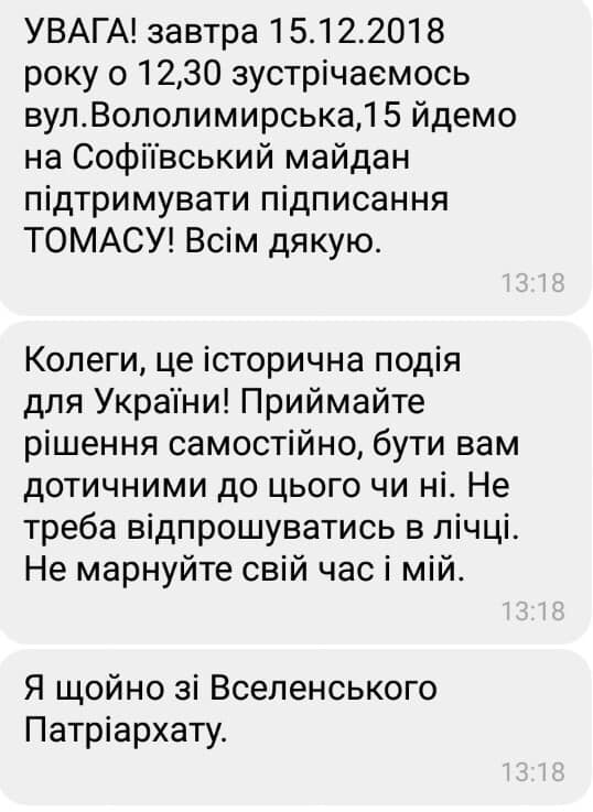 По данным пользователя FB Алены Парфеновой, написавшей в паблик "Батьки SOS", темник рассылают директорам школ. Учителей обязывают прийти в субботу, 15 декабря, на Софийскую площадь "чтобы поддерживать Томос".