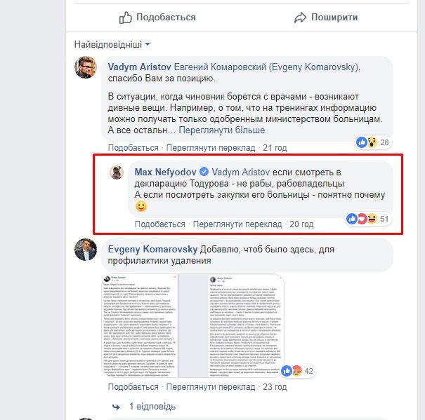 Единственный комментарий первого замминистра на странице Комаровского — это ответ пользователю, который поддержал действия Тодурова.