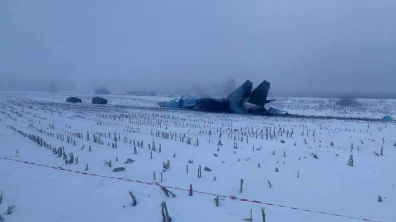 Истребитель скользил по земле. Появились фото рухнувшего в заснеженном поле под Житомиром Су-27
