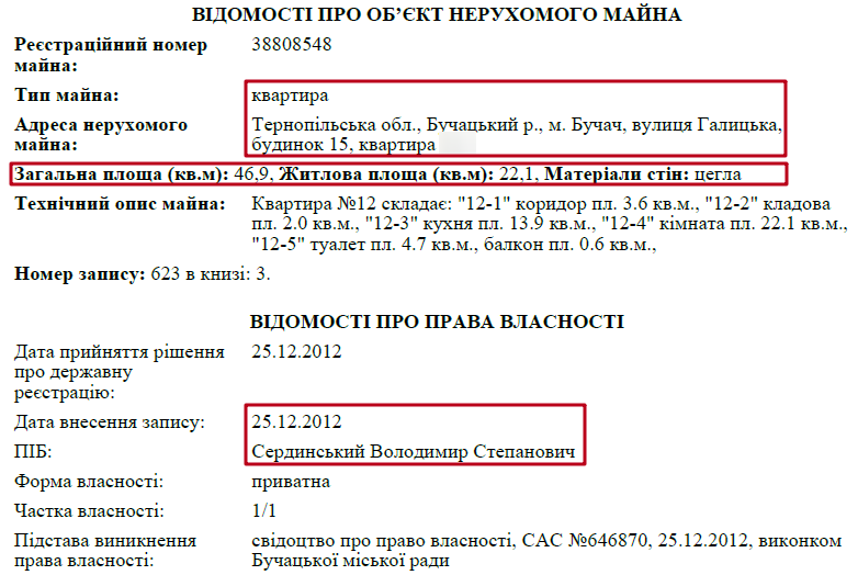 Незважаючи на наявність розкішного будинку, з 2008 року і до сьогодні Володимир Степанович Сердинський користується службовою квартирою. Задекларована її площа – 98 кв. м.