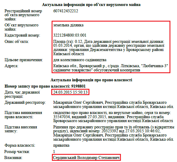 Як уже було зазначено, найбільше запитань до судді з приводу його майна у деклараціях за 2013, 2014, 2015, 2016, 2017 роки. За цей період Володимир Степанович Сердинський заробив 1,1 млн грн – весь цей дохід складається виключно із заробітної плати. Колишня дружина судді за період 2013-2016 років заробила лише 12 тис. грн. Однак саме Наталія Володимирівна досі є власницею будинку в Броварах площею 297,70 кв. м. Попри розлучення, суддя досі користується цим будинком, що вказано в його декларації за 2017 рік. За словами Володимира Степановича, землю під будинком його дружина отримала від Броварської міськради. Гроші на зведення цього житла суддя отримав від продажу 10 соток землі (за 100 тис. доларів) у 2007 році. Цю ділянку він теж отримав від Броварської міської ради.