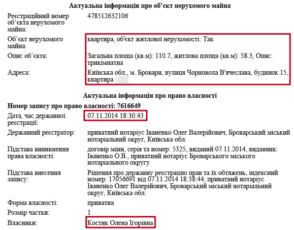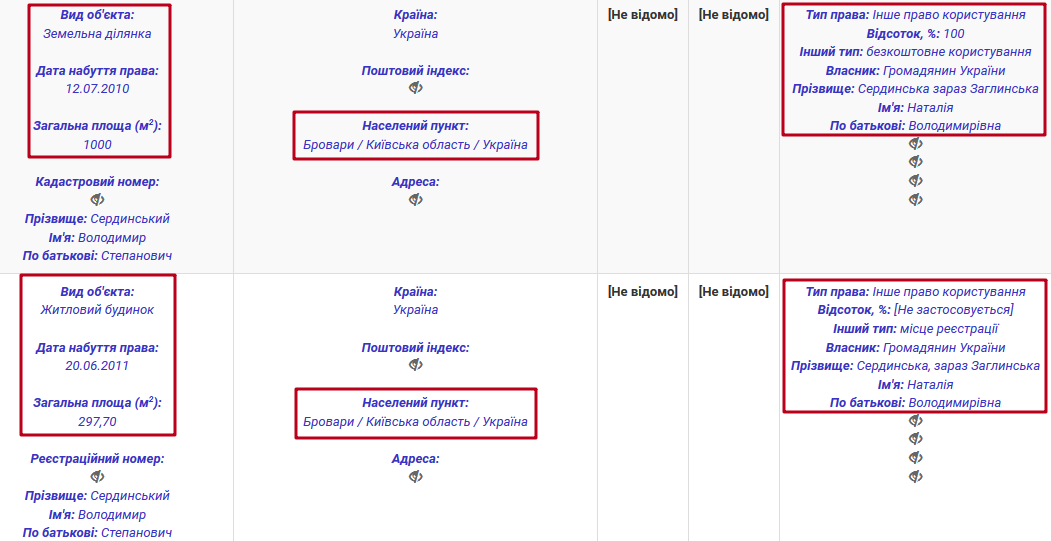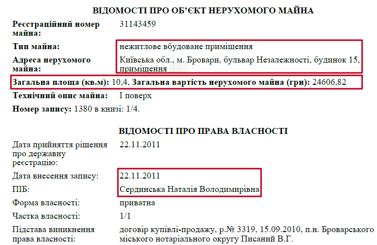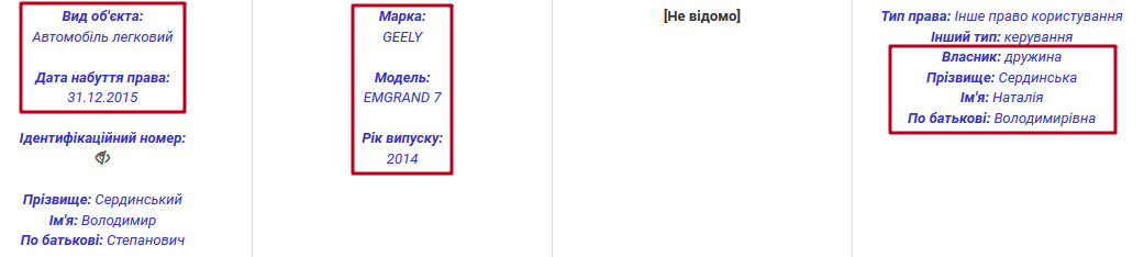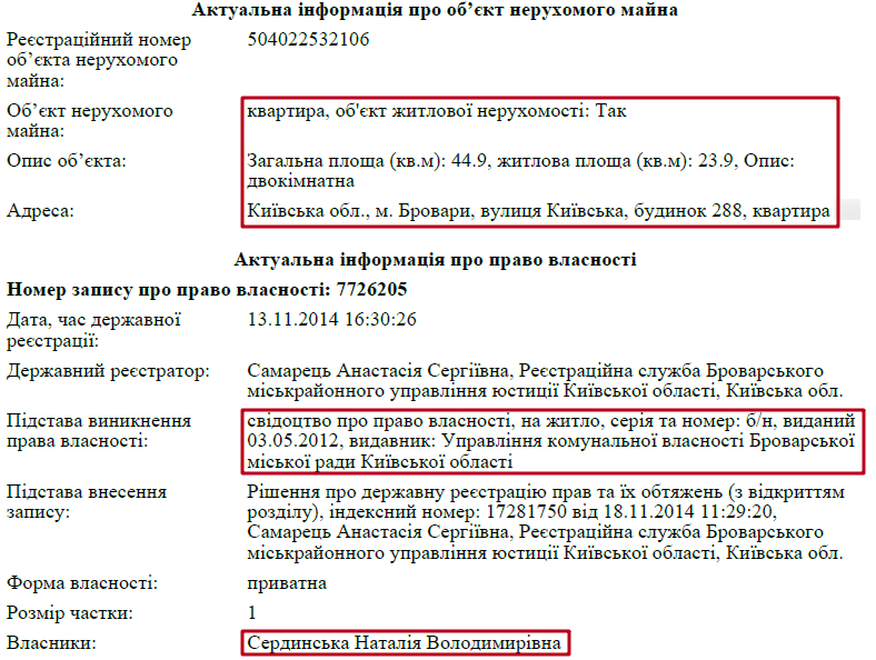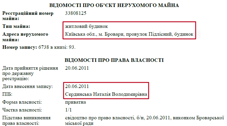 Оскільки Володимир Сердинський розлучився із Наталією Сердинською – частина її майна зникла із суддівської декларації. Зокрема мова йде про квартиру в Броварах, площею 44 кв. м. та автомобіль GEELY EMGRAND 7 2014 року випуску.