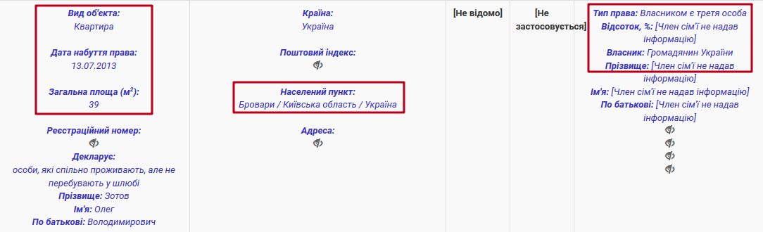 • У декларації за 2012 р. Кандидат задекларував квартиру (-и) загальною площею 95,9 кв. м, хоча відповідно до даних електронної декларації загальна площа квартир Кандидата складала 190,4 кв. м. Одна із земельних ділянок площею 1000 кв. м також була не задекларована Кандидатом.