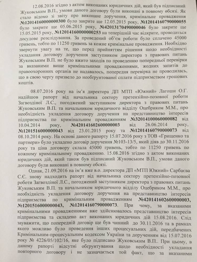 Первый договор с юристами подписали в июле 2016 года. К тому времени три первых уголовных производства уже были закрыты! Это не помешало Жуковскому организовать перевод на счета частной адвокатской фирмы 45 тыс. гривен. Более того, согласно внутреннему порядку работы порта, замдиректора не имел права самостоятельно назначать стоимость услуг.