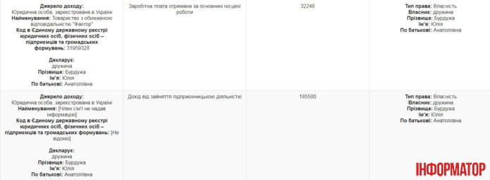 Дружина політика Юлія Бурдужа задекларувала ще менші заробітки: 185 500 гривень доходу від заняття підприємницькою діяльністю та 32 248 гривень зарплати.