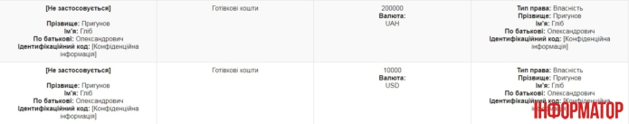 Дружина Пригунова задекларувала ще більші грошові активи. З готівки у неї – 40 тисяч доларів, а на рахунках в «Ощадбанку» – 35 тисяч доларів та 2 мільйона 88 тисяч гривень.