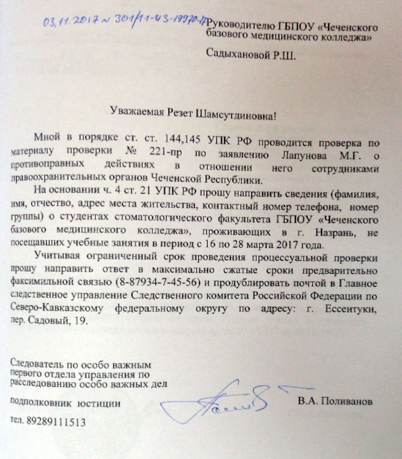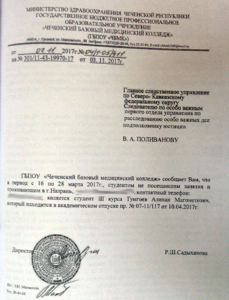В своем заявлении Максим Лапунов подробно рассказывает о содержавшихся вместе с ним в подвале жителях Чечни. В том числе о парне, которого Максим описывает как ингуша по имени Алихан, студента-медика, учившегося в Грозном. Отрабатывая эту информацию, следователь Поливанов сделал запрос на стоматологический факультет ГБПОУ «Чеченский базовый медицинский колледж» со следующей формулировкой: «Прошу направить сведения о студентах, проживающих в г. Назрань, не посещавших учебные занятия в период с 16 по 28 марта 2017 года». В ответ на этот запрос руководство колледжа представило следователю информацию о студенте из г. Назрань (Ингушетия) Алихане Тумгоеве, который «в период с 16 по 28 марта 2017 года не посещал занятия в колледже, а в начале апреля 2017 года оформил академический отпуск».